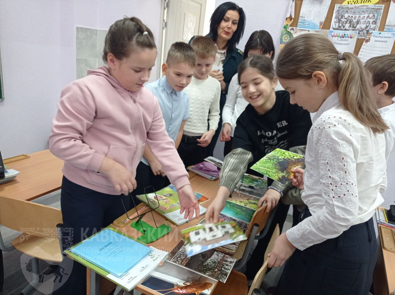 О Кавказском заповеднике ребята узнали из красочного фильма и фотографий. Кавказский государственный природный биосферный заповедник имени Х. Г. Шапошникова это одна из самых старейших особо охраняемых природных территорий нашей страны, а еще это самая большая особо охраняемая природная территория на Северном Кавказе. Это 2848 кв. км девственных лесов, альпийских лугов, горных ущелий и снежных вершин — строго охраняемый резерват, где запрещена любая человеческая деятельность. А печатные издания об ООПТ ребятам показали сотрудники АРЮБ. Дети смогли рассмотреть страницы Красных книг России, Краснодарского края и Республики Адыгея. Валентина Куцая рассказала ребятам, зачем нужны различные природные территории имеющие статус природоохранных, почему важно создавать их, вводить разные охранные режимы.