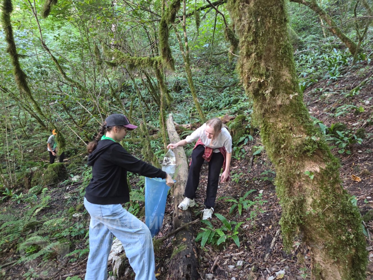 Благоустройство маршрута — очистка тропы от упавших веток и камней, чтобы сделать её безопасной для туристов. Перенос металлических прутьев — волонтёры вручную перенесли стройматериалы на расстояние 800 м вдоль реки Хосты для дальнейшего обустройства экотропы.