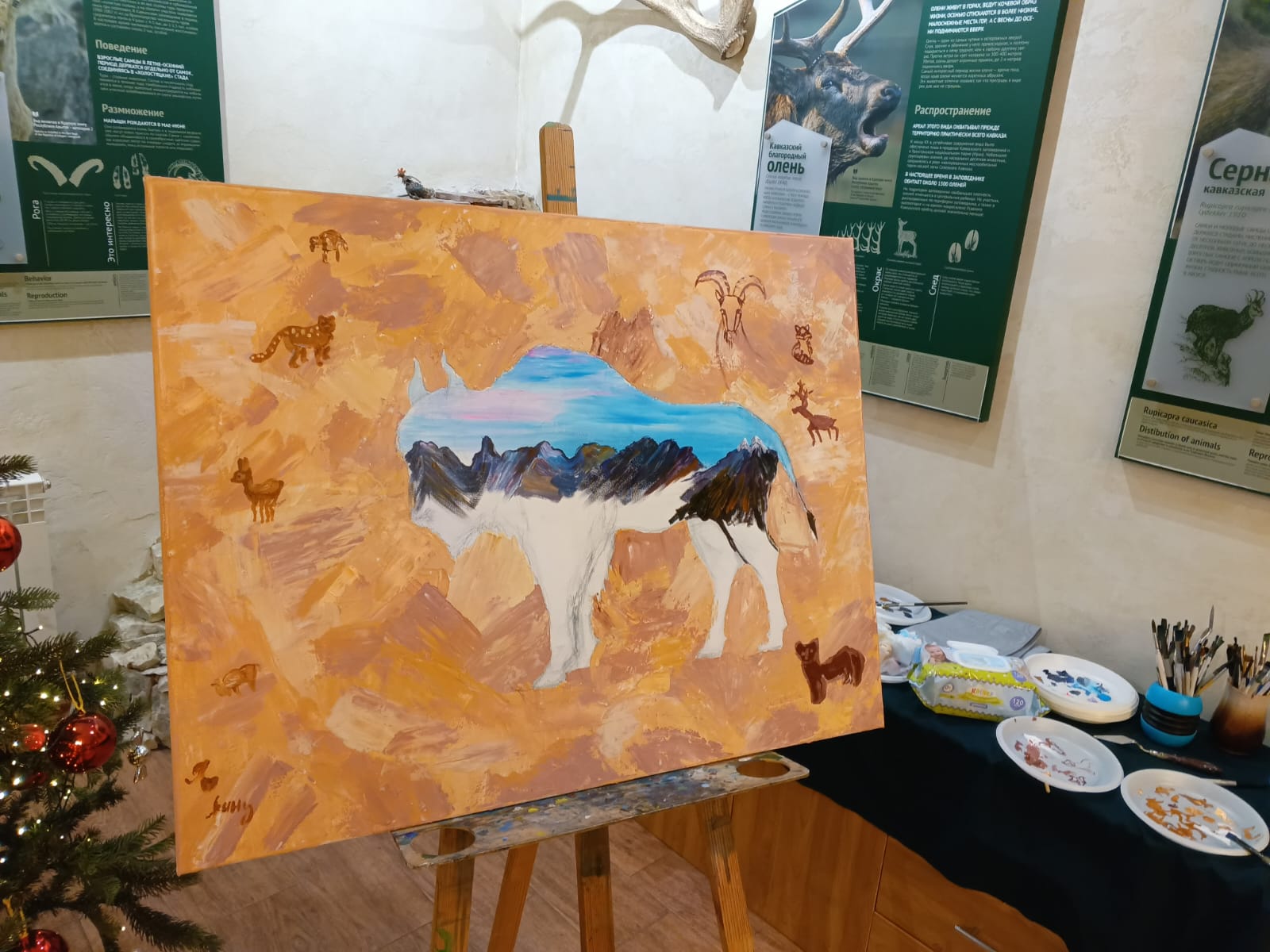 На вернисаже выставки художница Анна Хварна продемонстрировала серию акварельных работ с животными Кавказского заповедника и авторскими постерами с шелковых работ.