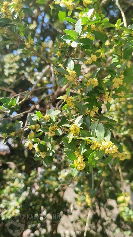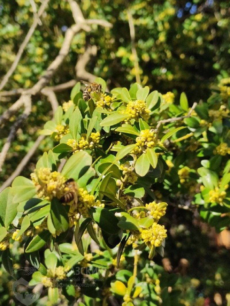 Проходит неделя. Очередной погожий денек, похожий на вчерашний, но что-то поменялось. На этот раз в воздухе разлит невероятный аромат цветущего самшита. Удивительно, что такие невзрачные мелкие желто-зеленые соцветия могут источать такой вкусный запах, сравнимый разве что с самыми изысканными французскими духами! Пчелы и прочие опылители реагируют незамедлительно, активно трудятся, «обрабатывая» цветки. Гул насекомых над самшитом в пору цветения стоит невообразимый.
